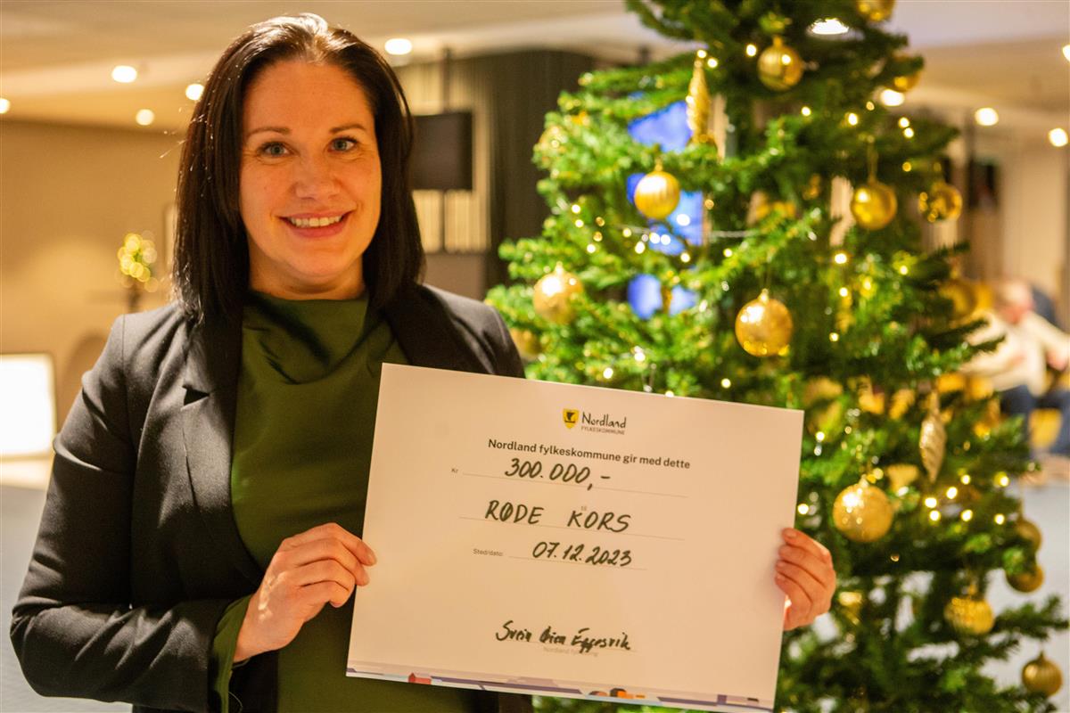 Bilde av kvinne med mørk, langt hår står foran et juletre og holder en symbolsk sjekk på 300 000 kroner. - Klikk for stort bildeRøde Kors' Merethe Rostløkken Wilhelmsen fikk tidlig julegave fra fylkestinget i år. Thor-Wiggo Skille