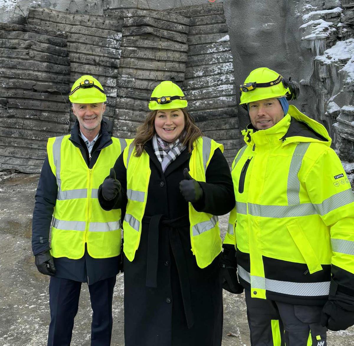 Tre personer i et steinbrudd. - Klikk for stort bildePå bildet ser vi fylkesråd for næring Svein Øien Eggesvik foran tunnellinngangen sammen med ordfører i Fauske Marlen Berg og prosjektkoordinator for Nye Sulithelma Gruver, Eirik Alst.