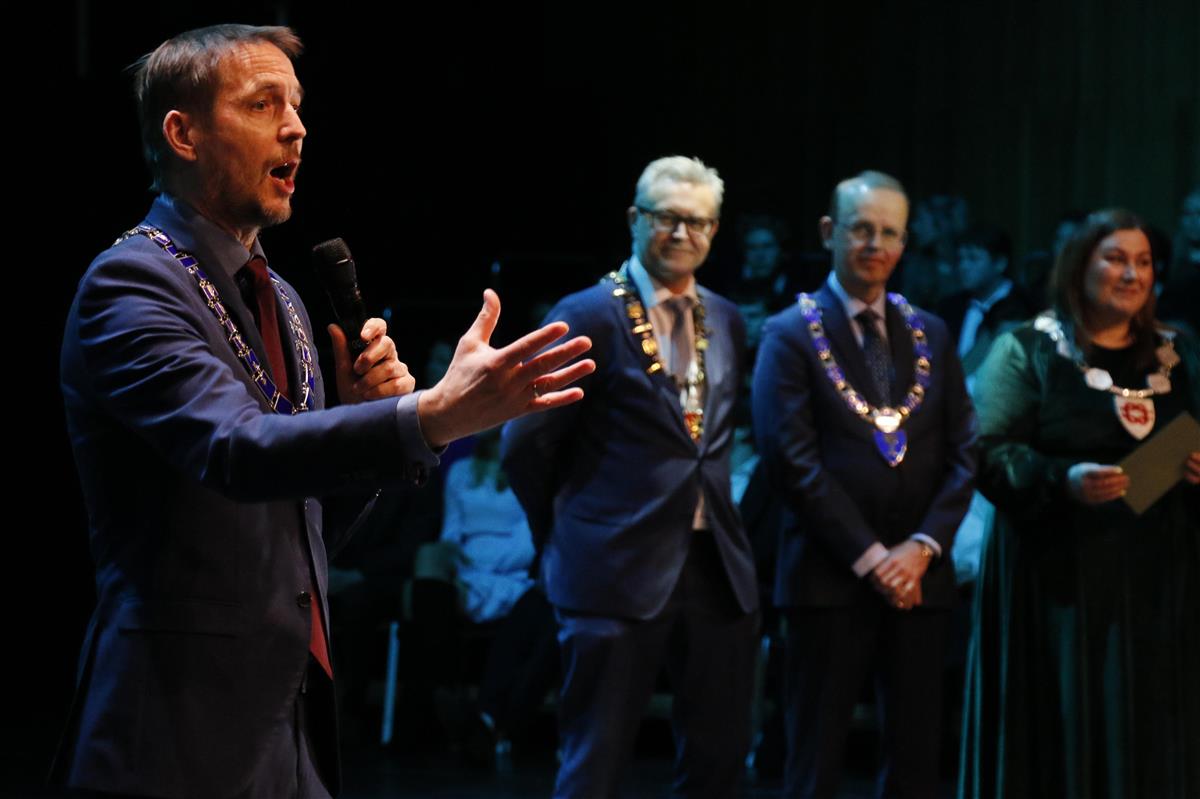 Ordførerne i Salten kom også på scenen på gallaen i Filmfest Salten, i forgrunnen på bildet ser vi Sigurd Stormo som er ordfører i Meløy.