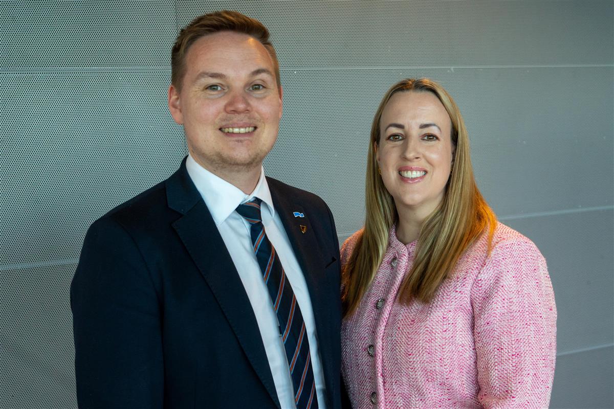 Smilende mann med slips og smilende kvinne. Foto. - Klikk for stort bildeFylkesråd for utbygging og eiendom Lise Henriette Rånes og fylkesråd for utdanning Joakim Sennesvik. Thor-Wiggo Skille