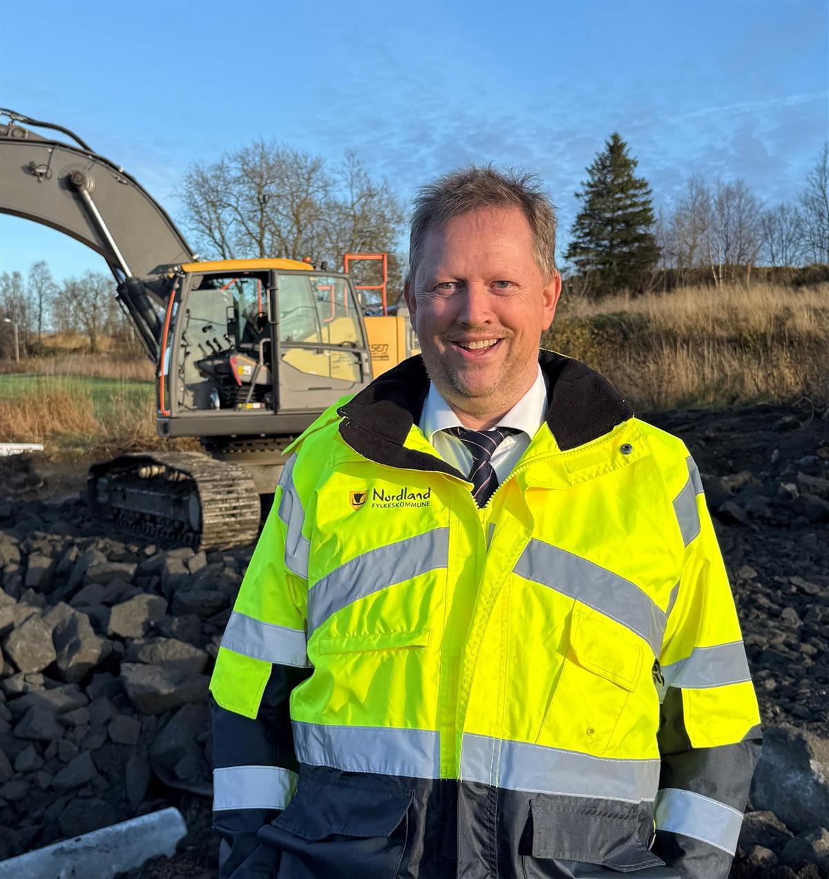 Mann i arbeidsjakke foran gravemaskin - Klikk for stort bildeFylkesråd for samferdsel, Richard Dagsvik (FrP). Thor-Wiggo Skille