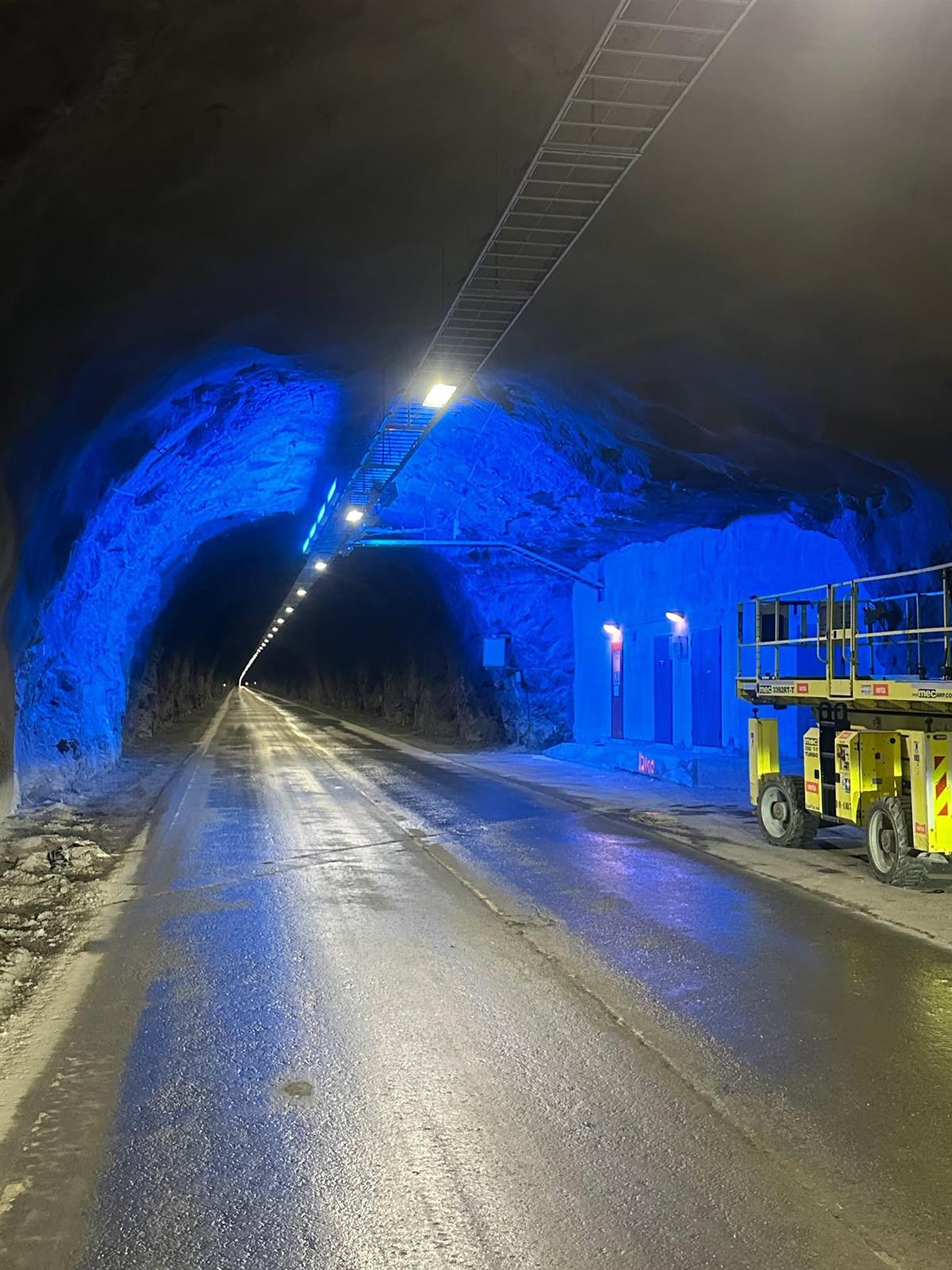 Blå lysfelt gir et brudd i den åtte kilometer lange tunnelen.