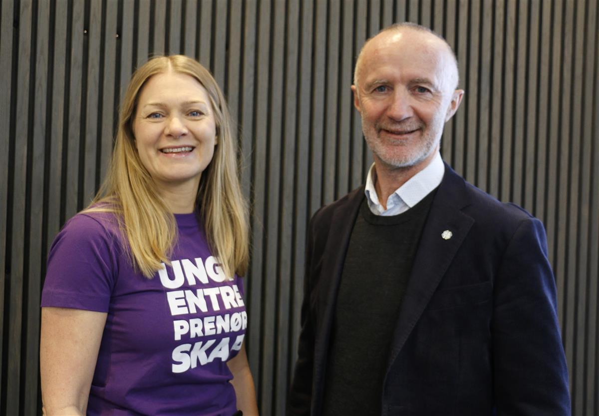 smilende mann og kvinne foran en spile-vegg. Foto. - Klikk for stort bildeHedda Eldøen er daglig leder i Ungt Entreprenørskap Nordland, her sammen med fylkeråd for næring Svein Øien Eggesvik (Sp) Trond-Erlend Willassen
