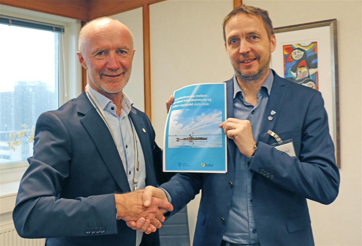 Fylkesrådsleder Svein Øien Eggesvik med avtalen som er inngått mellom Nordland fylkeskommune og Salten regionråd, her representert ved leder Sigurd Storm.