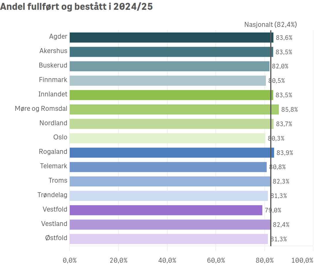 Grafisk fremstilling av andel fullført og bestått i 2025/25 etter fylke. - Klikk for stort bildeAndel fullført og bestått i 2025/25 etter fylke.