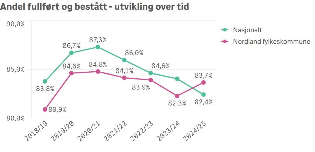 For skoleåret 2024/25 har hele 83,7 prosent av elevene på videregående skole i Nordland fullført og bestått.