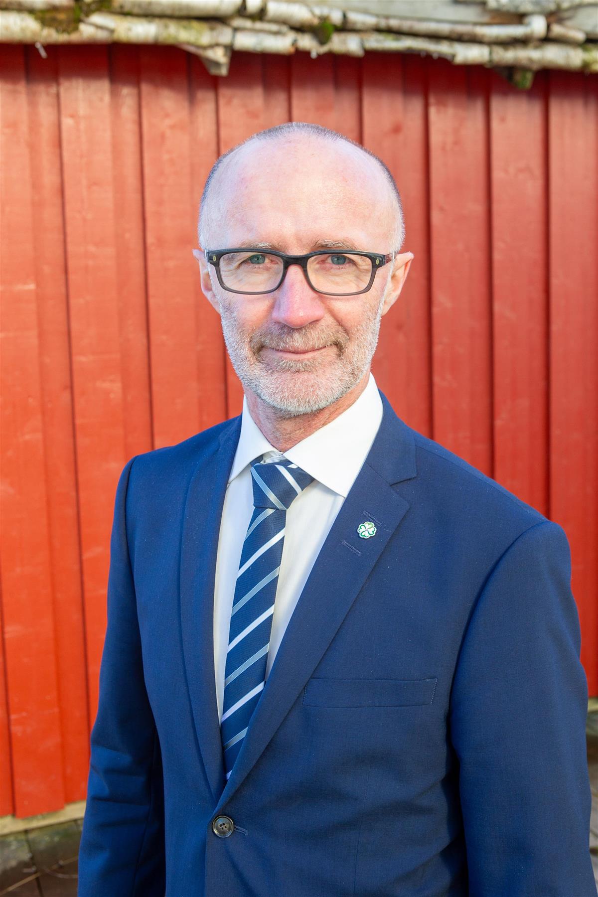 Mann kledd i blå dress foran rød vegg - Klikk for stort bildeFylkesrådsleder Svein Øien Eggesvik Thor-Wiggo Skille