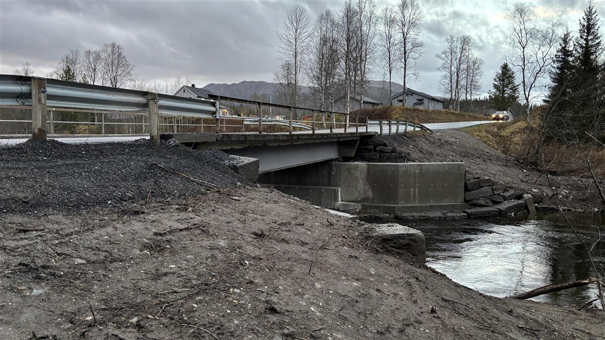 Kort bru over elv. Trær og boliger. En bil i retning brua.  - Klikk for stort bildeBrua har fått nye landkar. Nå blir det nye kantbjelker, nye rekkverk og ny asfalt. Ernst-Helge M. Storøy
