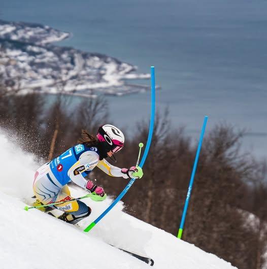 Alpinutøver som kjører nedover en løype med hav i bakgrunnen. Foto. - Klikk for stort bildeFra det fantastiske alpinanlegget i Narvik. Torje