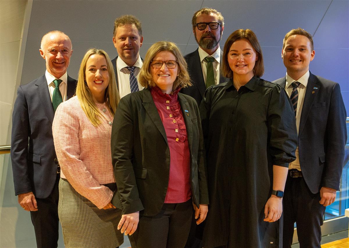 Syv smilende mennesker. Foto - Klikk for stort bildeFra venstre fylkesråd for næring Svein Øien Eggesvik (Sp), fylkesråd for utbygging og eiendom Lise Henriette Rånes (H), fylkesråd for samferdsel Richard Dagsvik (Frp), fylkesrådsleder Marianne Dobak Kvensjø (H), fylkesråd for samfunn, kultur og miljø Arne Ivar Mikalsen (V), Aina Nilsen (Sp), fylkesråd for finans og organisasjon og ny nestleder i fylkesrådet og Joakim Sennesvik som er fylkesråd for utdanning. Thor-Wiggo Skille