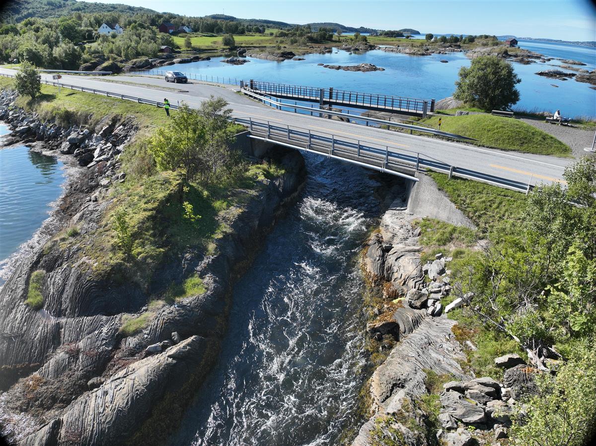 Vi skal også bygge en steinmur og gang- og sykkelvegbru Godøystraumen, slik at hele strekningen med gang- og sykkelveg legges på ene siden av vegen. Steinmuren er nødvendig for at vi ikke skal berøre verneområdet i sjøen.