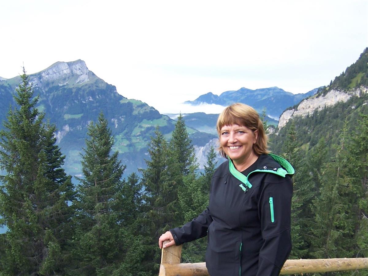 Person på tur i Sveits. Vi ser trær og fjell i bakgrunnen - Klikk for stort bildeHer er Trine på tur i Sveits. PRIVAT