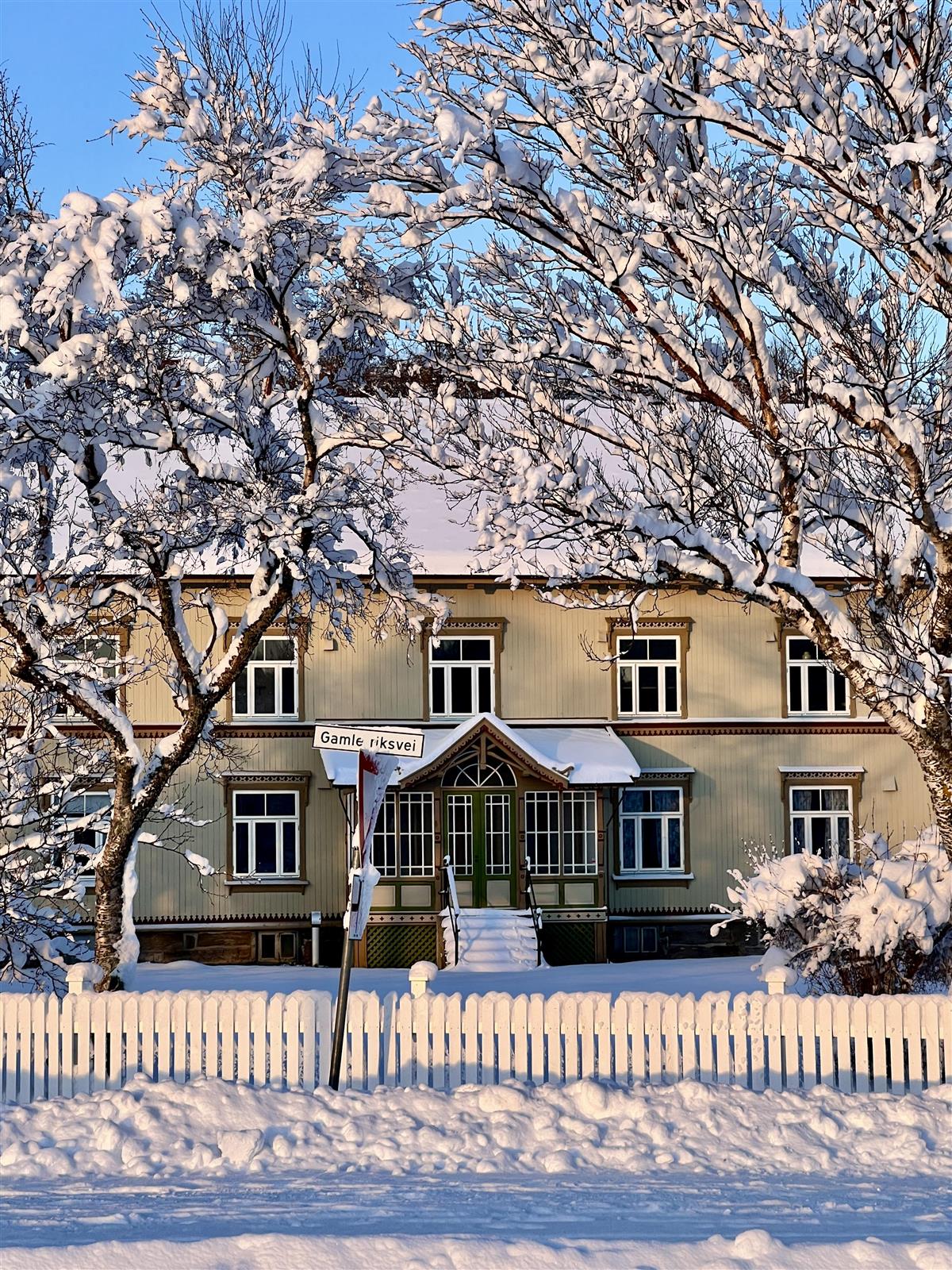 Gammel trebygning omgitt av trær. Det ligger snø på bakken og i trærne. - Klikk for stort bildeNordland kultursenter i vinterdrakt. Susanne Forsland