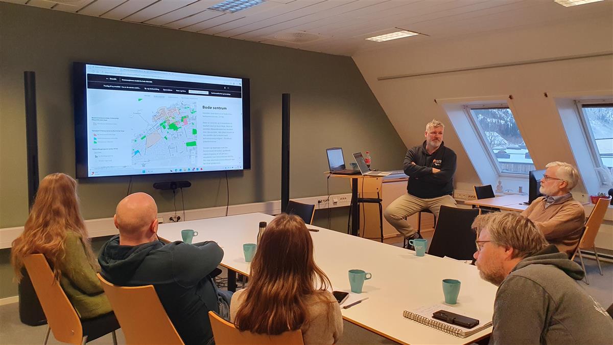 Mennesker rundt et bord som ser på en presentasjon - Klikk for stort bildeArkeolog og kulturminnerådgiver i Bodø kommune Vegard Kaasen Engen presenterer Bodø kommunes arbeid med kommuneplan Lill-Anita Horn